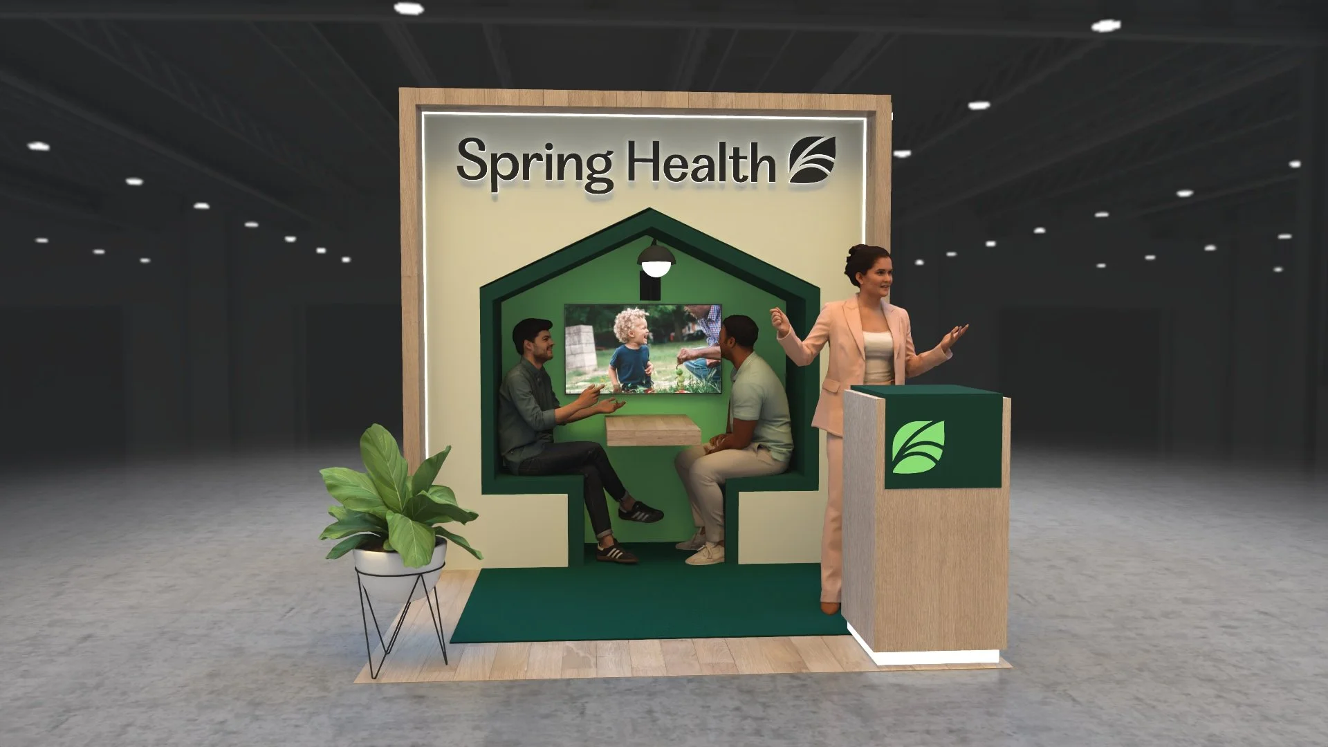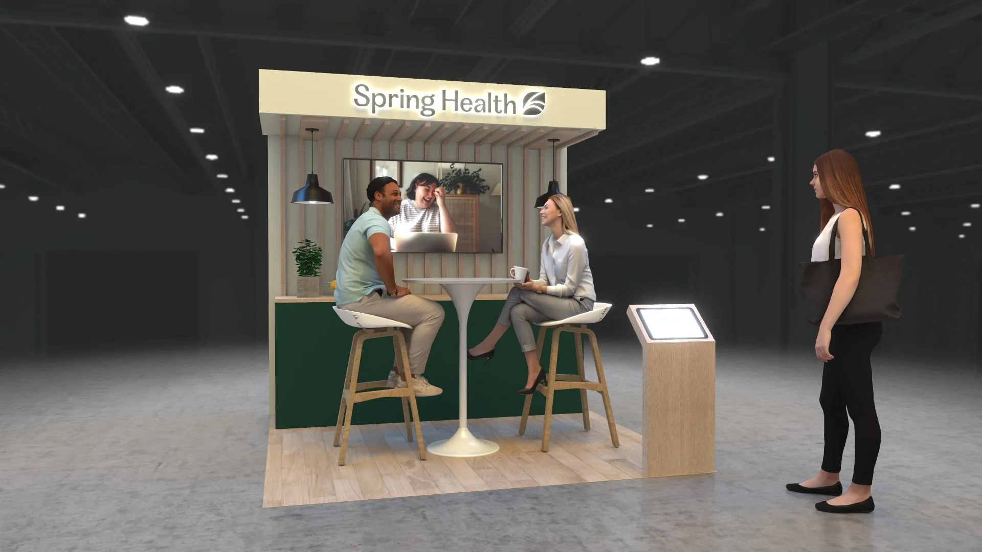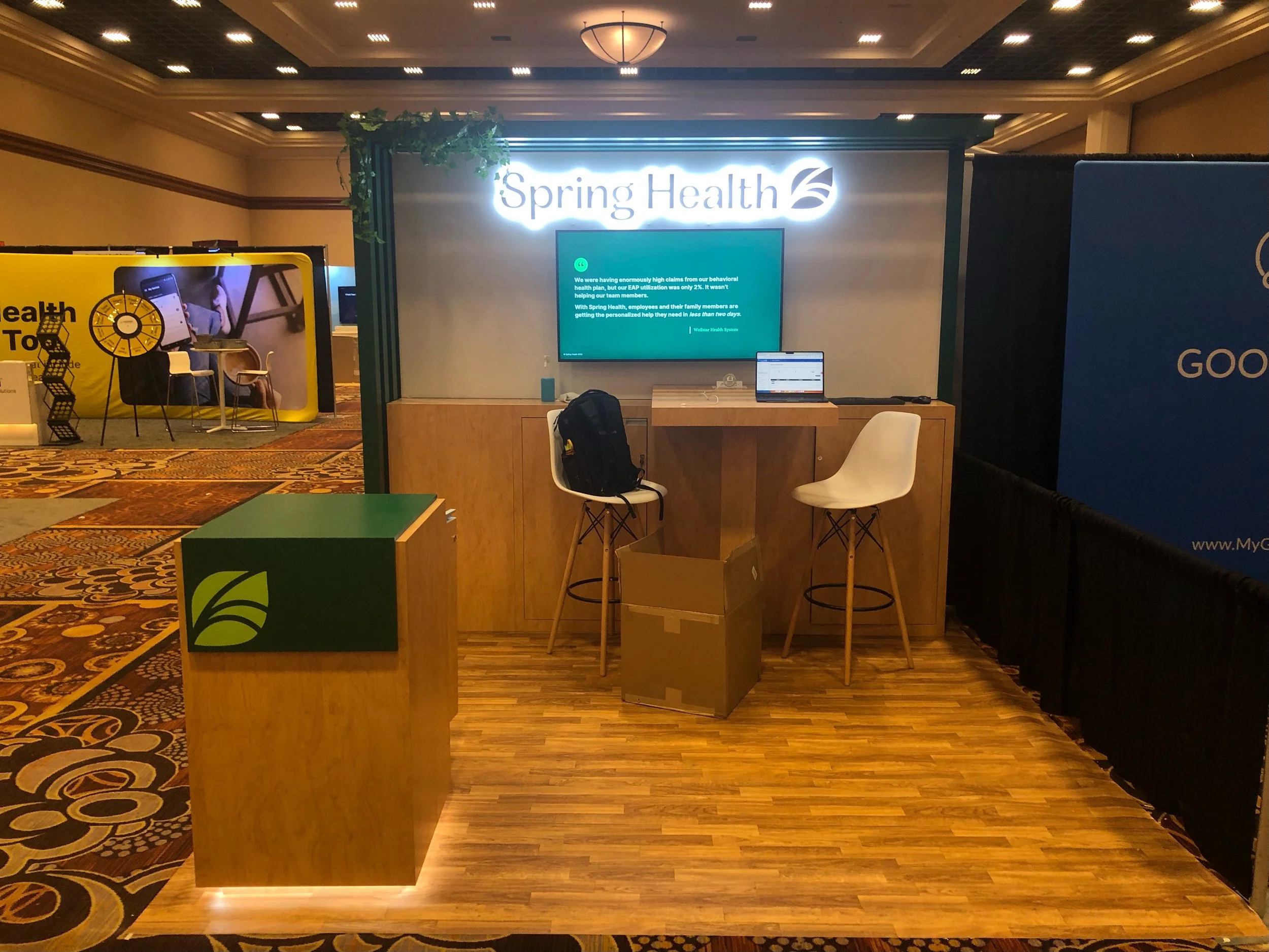 A warm, welcoming booth designed to promote mental wellness, featuring natural wood textures and greenery to symbolize growth, calm, and healing.