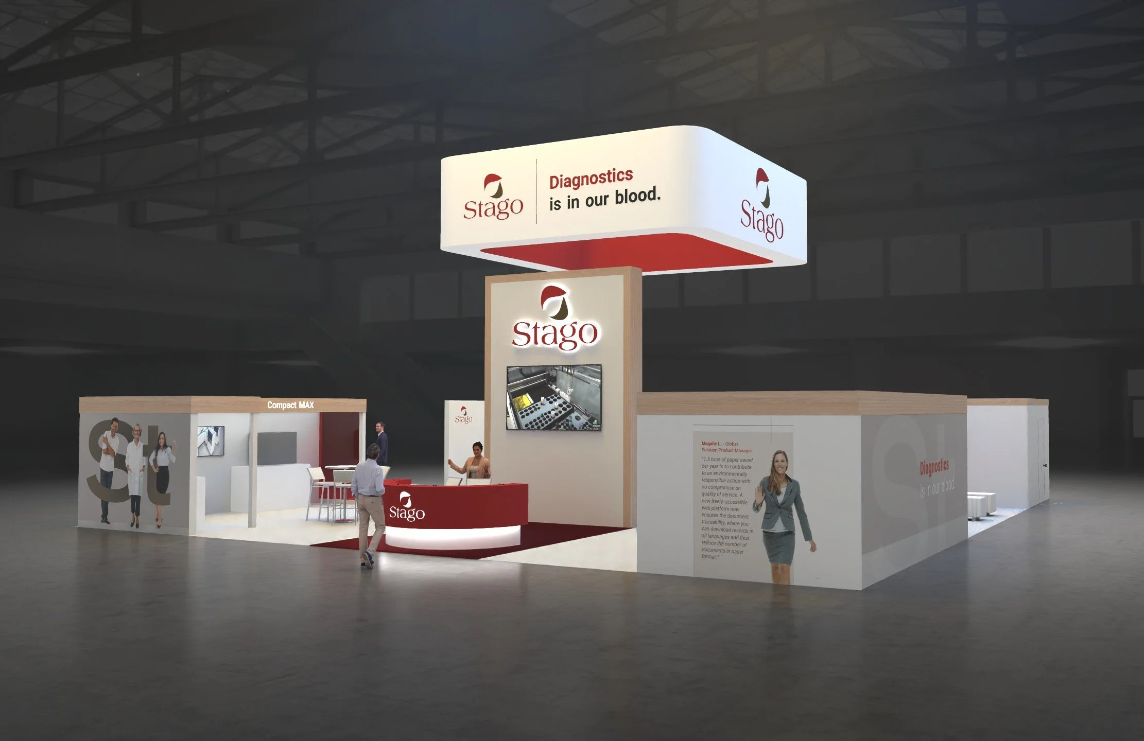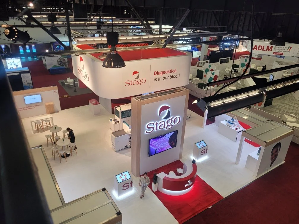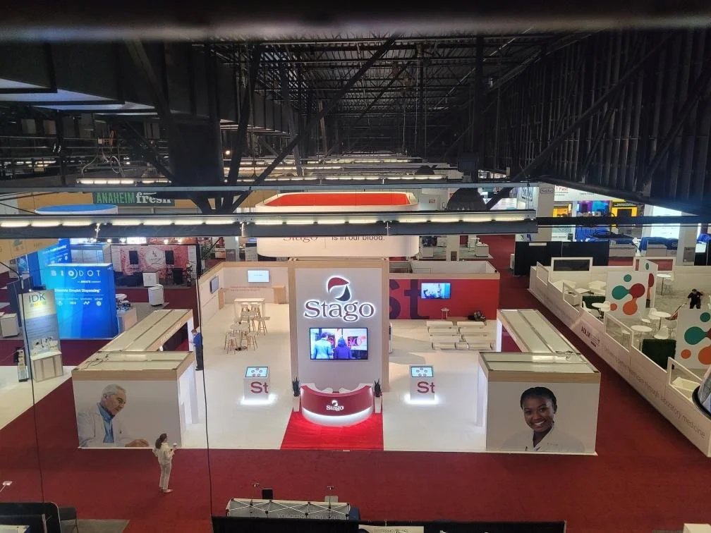 A clean, welcoming 40x40 exhibit created for Stago, designed to emphasize their message of precision and care in diagnostics. The structure features a strong central tower with integrated AV, framed by open, collaborative spaces for seating and conversation. Custom graphics and an overhead sign reinforce brand identity while maintaining a clinical, modern aesthetic.